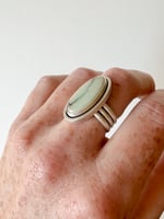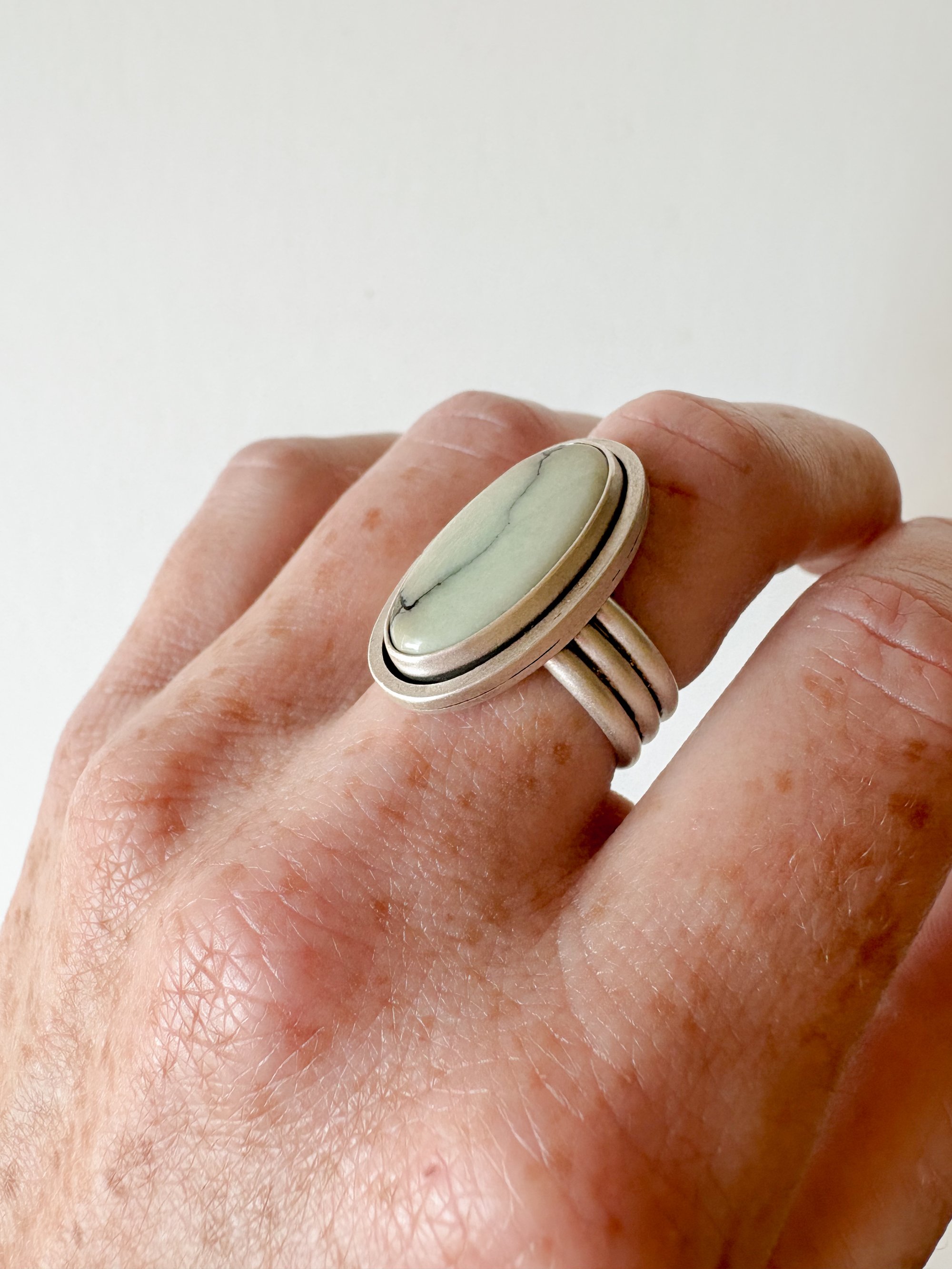 Soft sage and ivory tones flow through this Ivory Desert Bloom Variscite ring, set in handcrafted sterling silver. Minimalist and serene, it lets the stoneβs natural beauty shine.