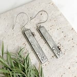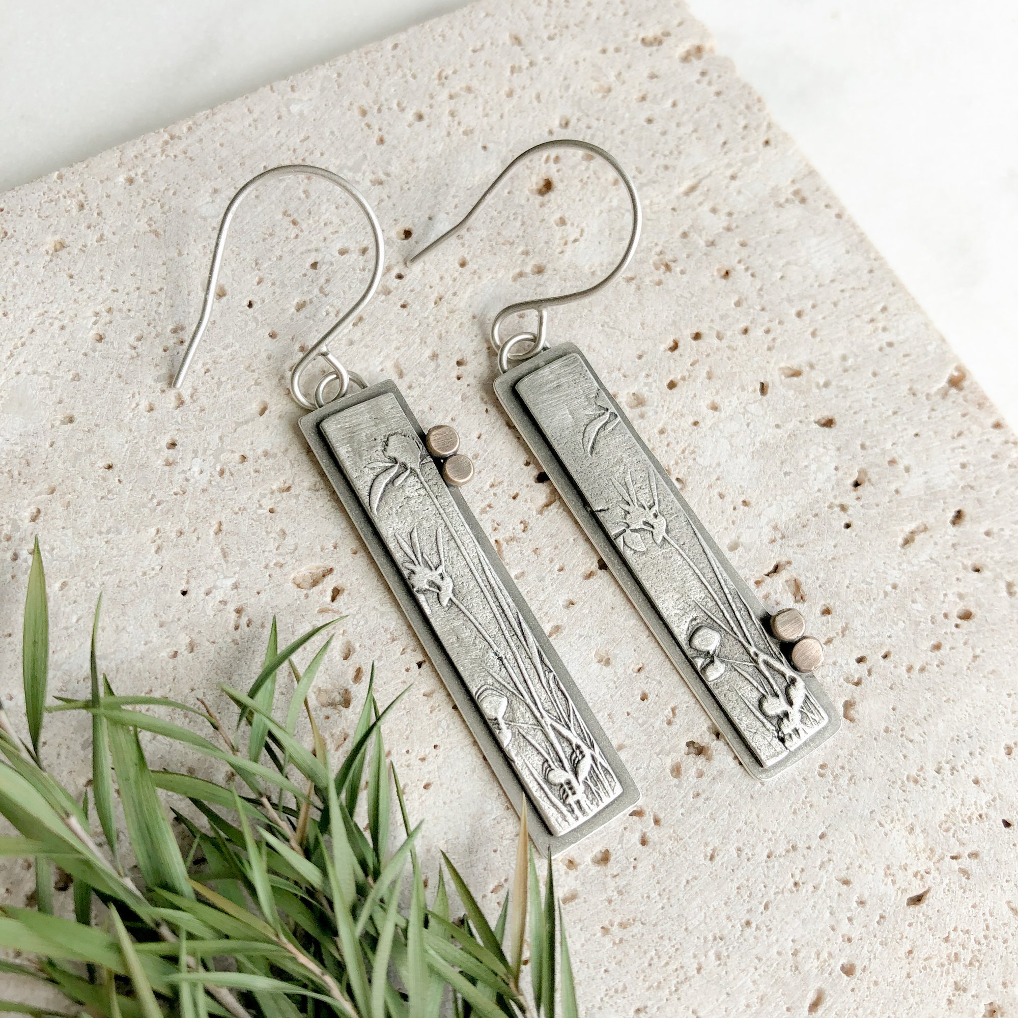 These earrings and construction from fine silver clay, a Sterling silver black plate and earwire, with 18k gold filled accents. They’re lightweight and perfect for sensitive ears!
