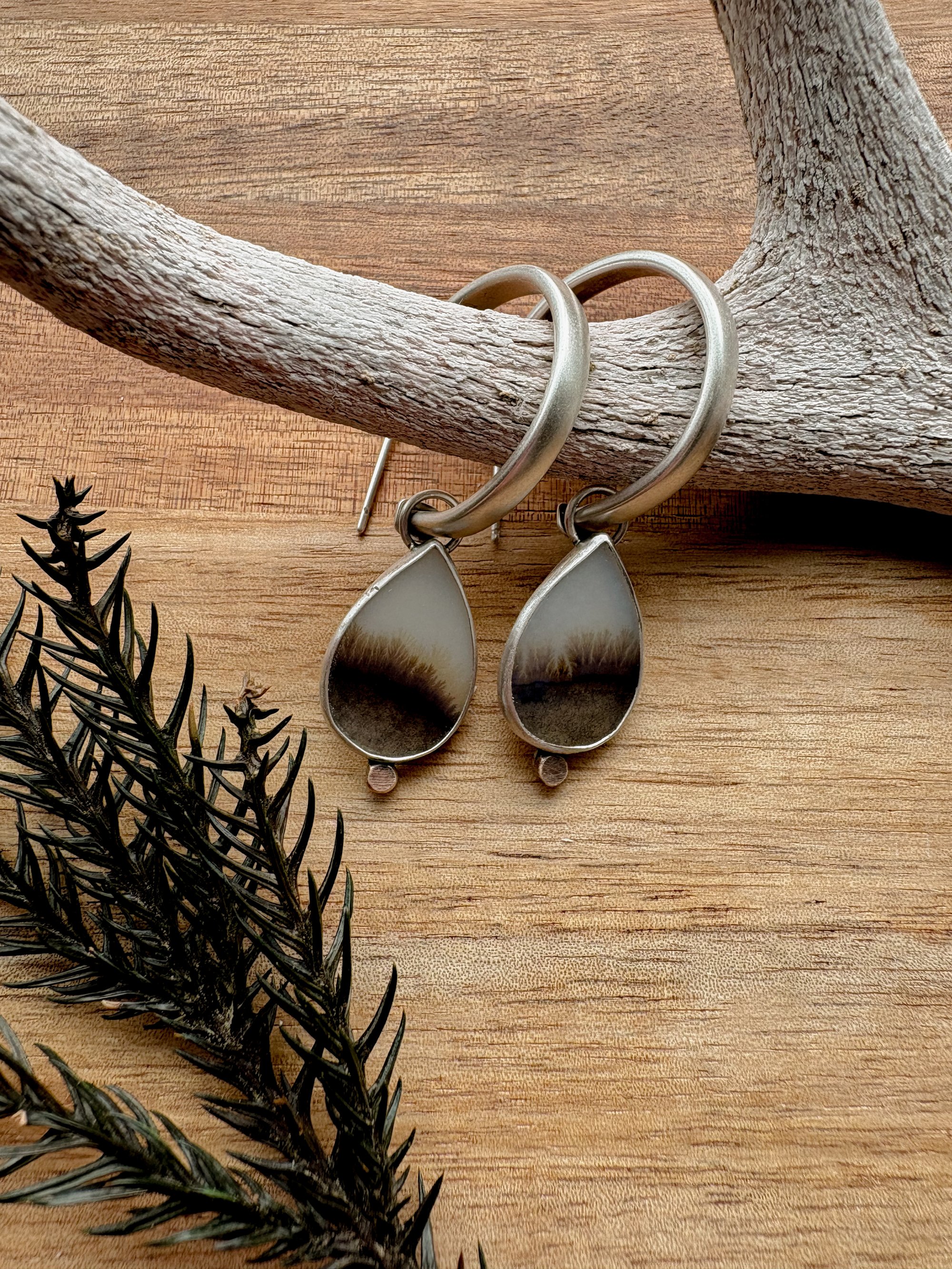 These one of a kind earrings feature stunning dendritic agates with dreamy natural patterns- each stone uniquely shaped by time and earth. Set in fine silver bezels the stones are anchored in sterling silver, with gold filled accents, forming a bold yet graceful silhouette.