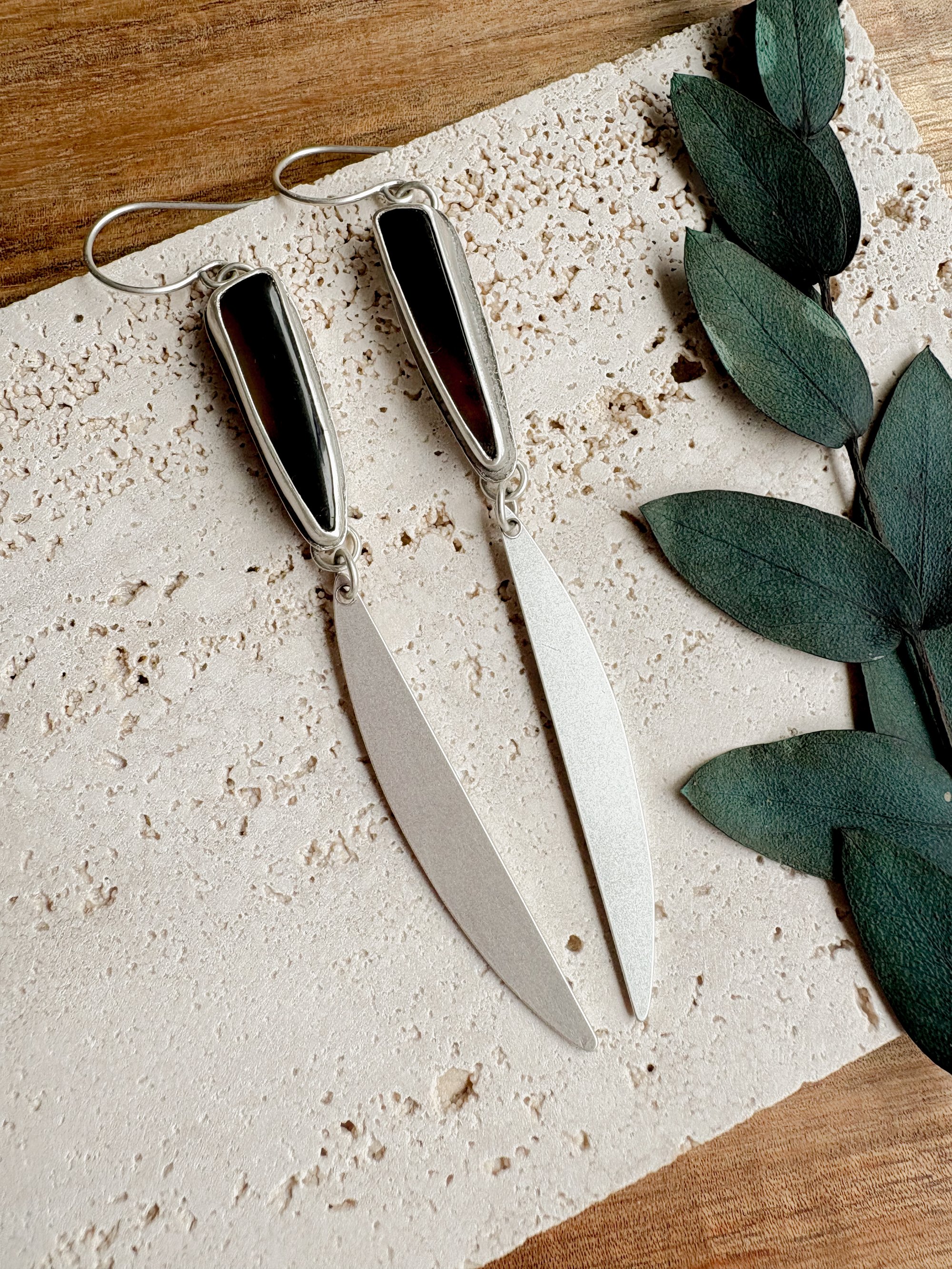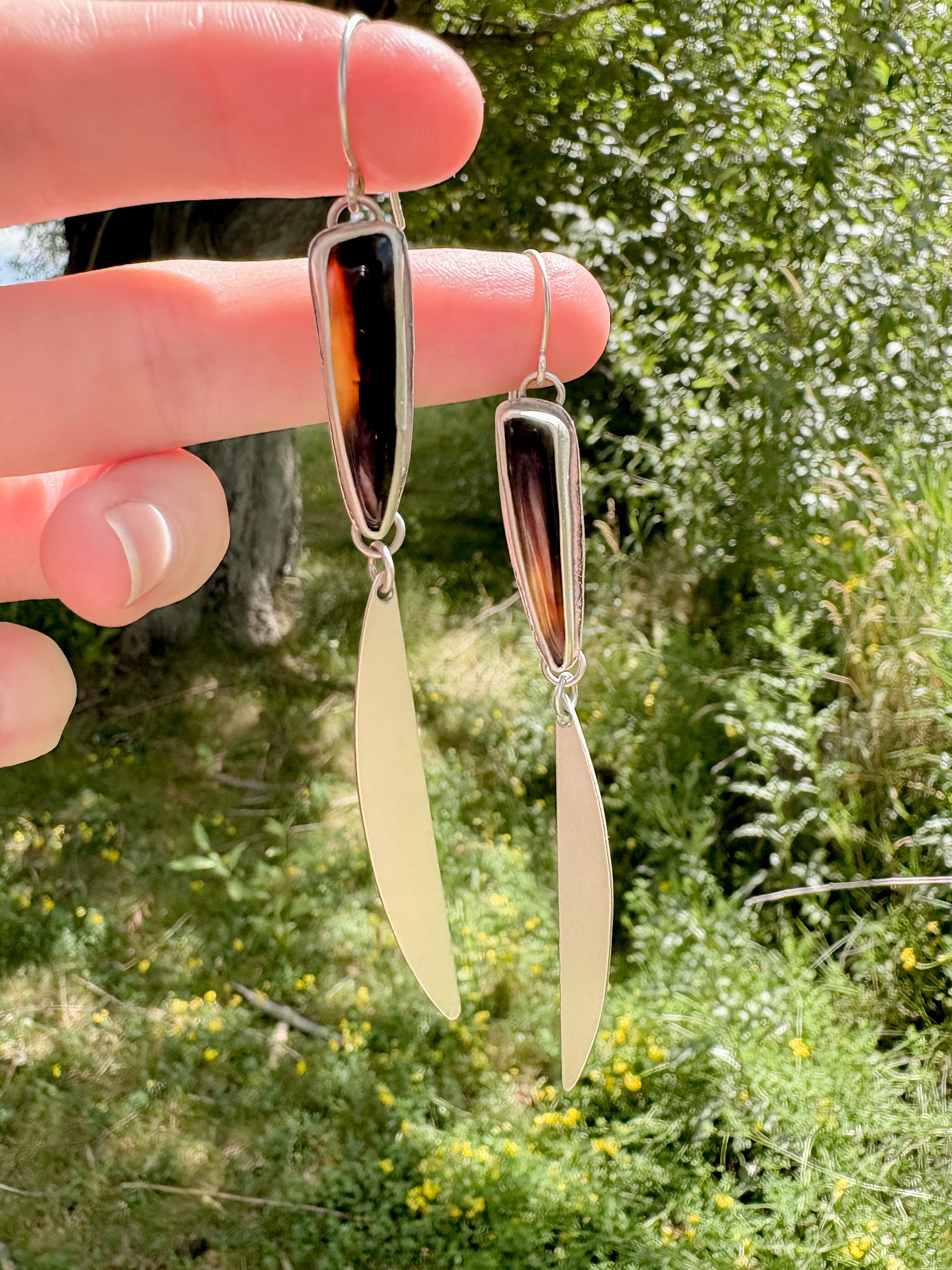 These striking earrings feature tapered Montana agates with deep, moody bands of caramel, smoke, and shadow-like amber caught mid-flame. Set in fine silver bezels and anchored on sterling ear wires, each stone is paired with a sleek, hand-cut silver blade that moves gently with you.
