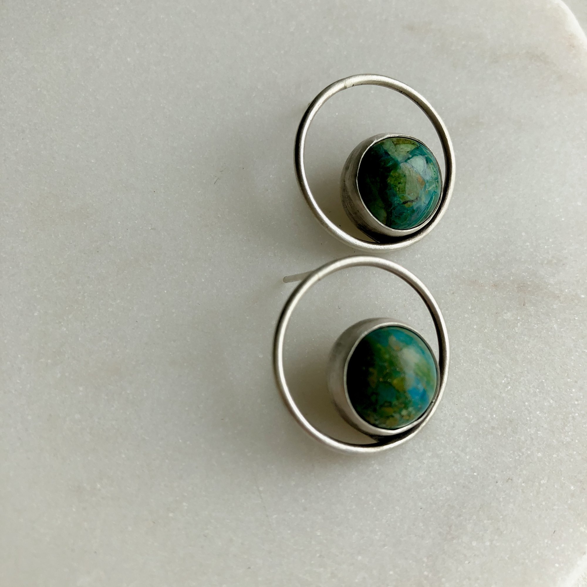 These earrings are constructed from fine silver and Sterling silver, with Peruvian opals. They’re lightweight and perfect for sensitive ears!